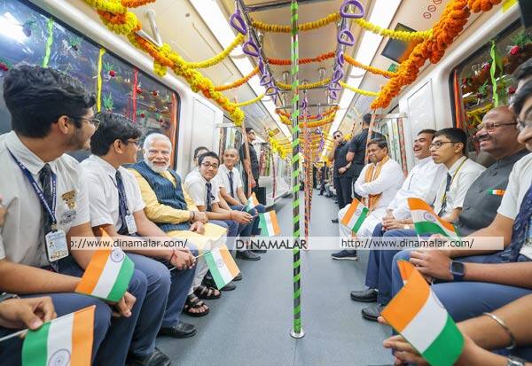சேவையை துவக்கி வைத்த பிரதமர் மோடி, அதில் பயணித்த போது மாணவர்களுடன்