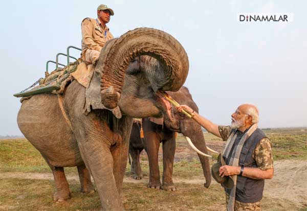அசாம் மாநிலத்தில் உள்ள காசிரங்கா தேசிய பூங்காவில் யானைகளுக்கு பிரதமர் மோடி உணவளித்தார்.