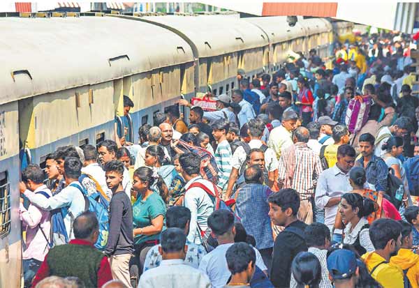 ஹோலி பண்டிகையை கொண்டாட சொந்த ஊர் செல்வதற்காக ரயில் நிலையத்தில் குவிந்த மக்கள். இடம்: பாட்னா. பீஹார்