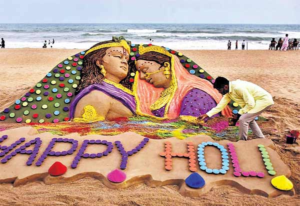 ஹோலி பண்டிகையையொட்டி, மணல் சிற்ப கலைஞர் சுதர்சன் பட்நாயக் உருவாக்கிய மணல் சிற்பம். இடம்: ஒடிசாவின் புரி கடற்கரை .