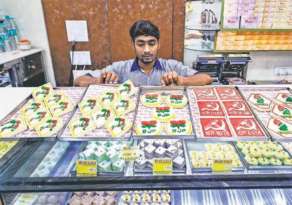 லோக்சபா தேர்தல் நடப்பதையடுத்து அரசியல் கட்சிகளின் சின்னங்களுடன் தயாரிக்கப்பட்டு உள்ள இனிப்பு விற்பனை பிரபலமாகி உள்ளது. இடம் : ஹவுரா, மேற்கு வங்கம்