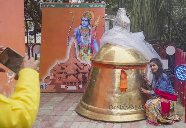 ராமர் கோயிலுக்காக செய்யப்பட்ட பிரமாண்ட மணியுடன் போட்டோ எடுத்து கொண்ட பக்தை.
