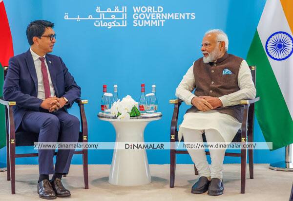 அபுதாபியில் பிரதமர் மோடியை சந்தித்து பேசிய மடகாஸ்கர் அதிபர் ஆண்ட்ரி ராஜோலினா.