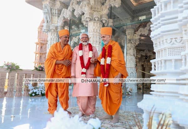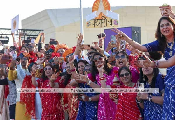 கோயில் திறப்பு விழாவில் பங்கேற்க வந்த பிரதமரை வரவேற்க குவிந்த இந்திய வம்சாவளியினர்.