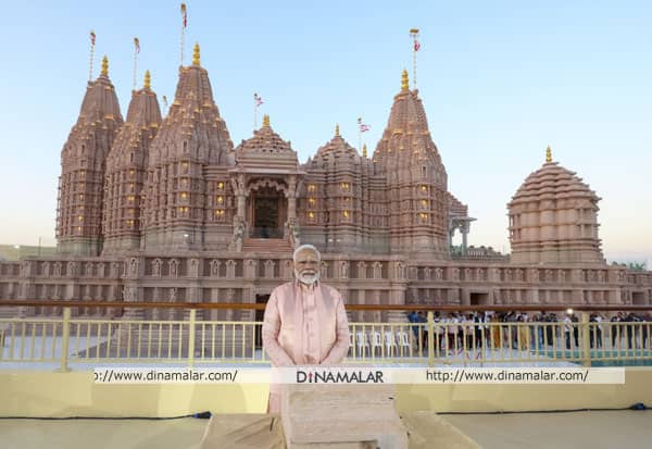 அபுதாபியில் திறக்கப்பட்ட முதல் ஹிந்து கோயில் முன் மோடி.