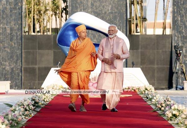 அபுதாபியில் திறக்கப்பட்ட முதல் ஹிந்து கோயில் முன் மோடி.