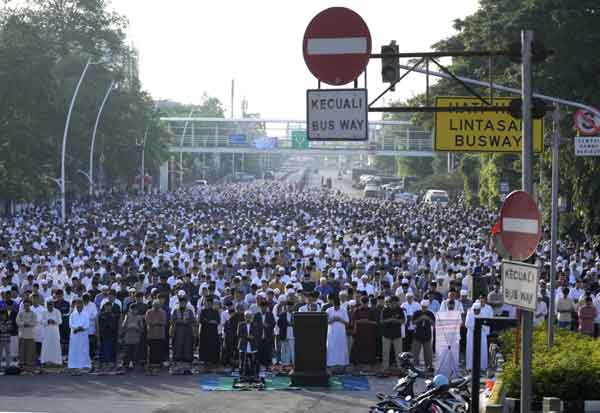 இந்தோனேசியாவின் ஜகார்த்தாவில் சாலையில் இஸ்லாமியர் புனித ரமலான் சிறப்பு தொழுகையில் ஈடுபட்டனர்.