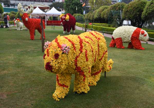 ஊட்டி தாவரவியல் பூங்கா, மலர் கண்காட்சியில், மலர் அலங்காரங்களை ரசித்து செல்லும் சுற்றுலா பயணிகள்.