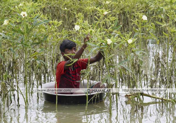 வெள்ளத்திற்கு மத்தியிலும் பூ பறிக்கும் சிறுவன்