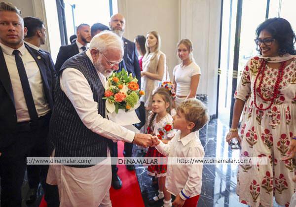 வார்சா நகரில் ஓட்டலுக்கு வந்த மோடியை வரவேற்ற குழந்தைகள்.