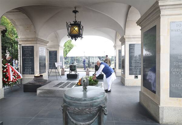 வார்சா நகரில், போர் வீரர்கள் நினைவிடத்தில் பிரதமர் மோடி அஞ்சலி செலுத்தினார்.