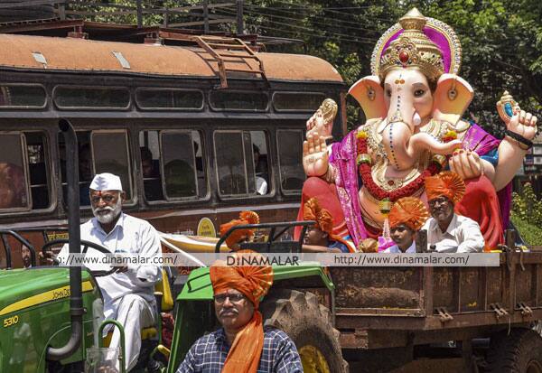 வழிபாடு செய்வதற்காக விநாயகர் சிலையை டிராக்டரில் கொண்டு செல்லும் பக்தர் . இடம்: கராத், மஹாராஷ்டிரா