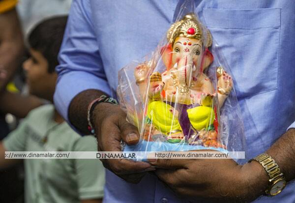 பூஜைக்காக விநாயகர் சிலையை வாங்கி செல்லும் பக்தர். இடம்: மும்பை
