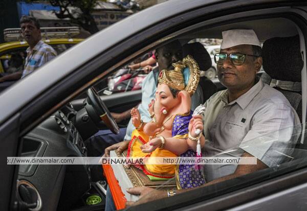 காரில் விநாயகர் சிலையுடன் பக்தர்.