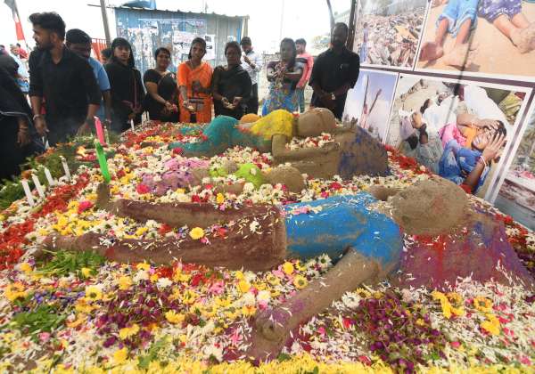 20ம் ஆண்டு சுனாமி நினைவு தினத்தை முன்னிட்டு மணல் சிற்பத்திற்கு மீனவர்கள் மலர் தூவி மரியாதை செலுத்தினர். இடம்: சென்னை காசிமேடு மீன்பிடி துறைமுகம்.