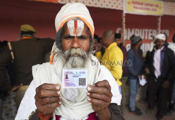 மஹா கும்பமேளாவில் பங்கேற்க வந்த சாது ஒருவர் தன் அடையாள அட்டையை காண்பிக்கிறார்.