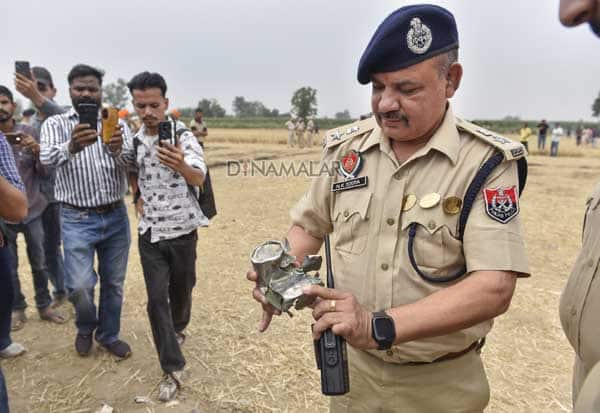 இந்தியா , பாகிஸ்தான் இடையே நடந்து வரும் ஆயுத தாக்குதலில் பஞ்சாப் மாநிலம் ஜலந்தரில் , பாகிஸ்தான் தாக்குதலில் சிதறி கிடக்கும் உதிரி பாகங்களை போலீசார் ஆய்வு செய்கிறார்.