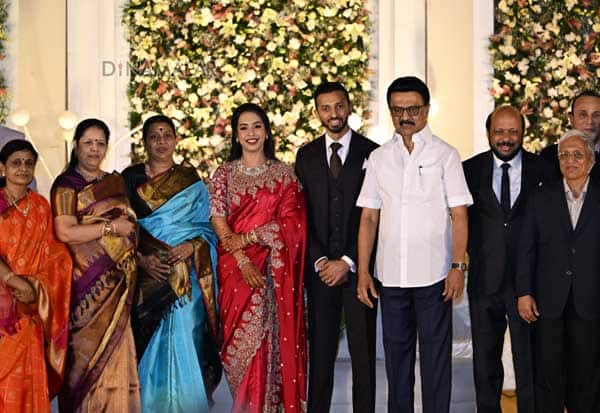 மணமக்கள் அபராஜித் - தர்ஷனா ஆகியோரை முதல்வர் ஸ்டாலின் தன் மனைவி துர்காவுடன் வந்து வாழ்த்தினார். அருகில் தினமலர் வெளியீட்டாளர்கள், எல்.ஆதிமூலம், டாக்டர் எல்.ராமசுப்பு.