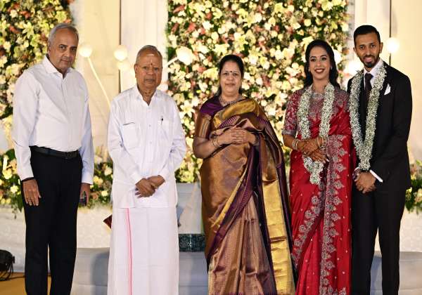 தினமலர் நாளிதழ் கோவை பதிப்பு வெளியீட்டாளர் எல்.ஆதிமூலம் -- சுதா ஆதிமூலம் தம்பதியின் மகள் திருமணம் சென்னையில் (ஜூன்-8) விமர்சையாக நடந்தது. மணமக்களை வாழ்த்திய வேலம்மாள் கல்வி அறக்கட்டளையின் தலைமை நிர்வாகி வேல்முருகன்,