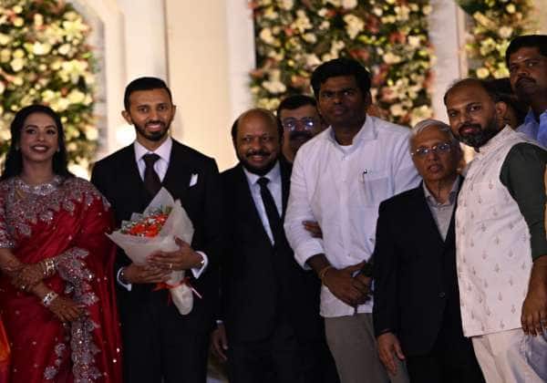 தினமலர் வெளியீட்டாளர் எல்.ஆதிமூலம்- சுதா ஆதிமூலம் மகள் திருமண வரவேற்பு நிகழ்ச்சியில் பங்கேற்ற பா.ஜ., முன்னாள் தலைவர்அண்ணாமலை மணமக்கள் தர்ஷனா-அபராஜித்தை வாழ்த்தினார்.