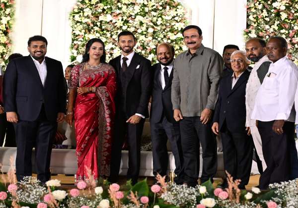 தினமலர் நாளிதழ் கோவை பதிப்பு வெளியீட்டாளர் எல்.ஆதிமூலம் -- சுதா ஆதிமூலம் தம்பதியின் மகள் திருமணம் சென்னையில் (ஜூன்-8) விமர்சையாக நடந்தது. மணமக்களை வாழ்த்திய வேலம்மாள் கல்வி அறக்கட்டளையின் தலைமை நிர்வாகி வேல்முருகன்,
