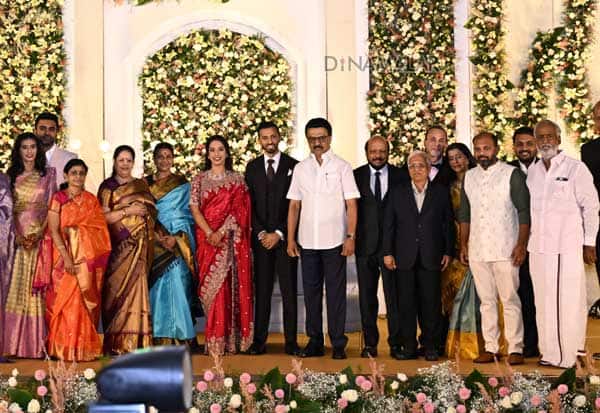 தினமலர் நாளிதழ் கோவை பதிப்பு வெளியீட்டாளர் எல்.ஆதிமூலம் -- சுதா ஆதிமூலம் தம்பதியின் மகள் திருமணம் சென்னையில் (ஜூன்-8) விமர்சையாக நடந்தது. நிகழ்ச்சியில் பங்கேற்ற முதல்வர் ஸ்டாலினை வரவேற்ற தினமலர் இணை நிர்வாக ஆசிரியர் பத்மஸ்ரீ டாக்டர். ஆர்.லட்சுமிபதி, நடுவில் இணை இயக்குநர் ஆர்.லட்சுமிபதி.