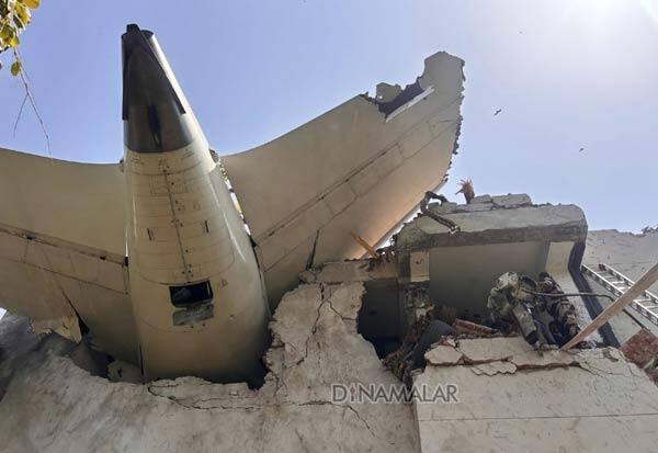 விமான விபத்தில் நொறுங்கி விழுந்த பாகங்கள் கட்டடங்கள் மீது சாய்ந்து கிடக்கிறது.