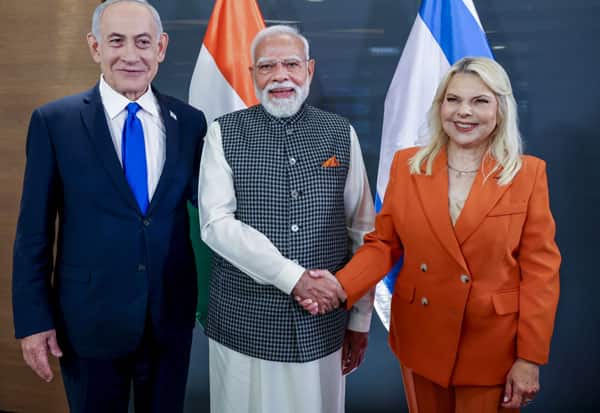 டெல் அவிவ் நகரில் பிரதமர் மோடி, இஸ்ரேல் பிரதமர் நெதன்யாகு, அவரது மனைவி சாரா.