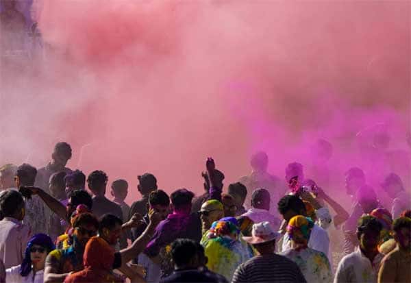 ஹோலி பண்டிகையை ஒட்டி, வண்ண பொடி தூவி கொண்டாடினர். இடம்: பிரைம் அபார்ட்மென்ட், திருப்பூர்.