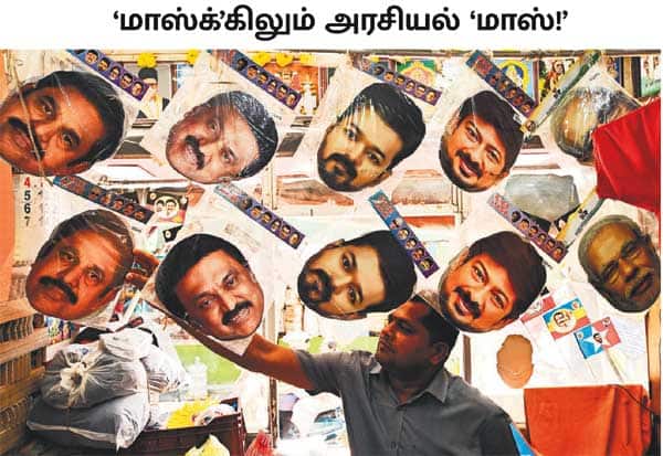பிரசார மேடையில் தலைவர்கள் கர்ஜிப்பதற்கு முன்பே தொண்டர்கள் தங்கள் முகத்தில் தலைவர்களை சுமக்க துவங்கிவிட்டனர். மாஸ்க்கை கழற்றினால் நான் மாட்டிக் கொண்டால் என் தலைவர் என்ற ரேஞ்சுக்கு கலக்கி வருகின்றன இந்த லீடர் மாஸ்க்குகள்.