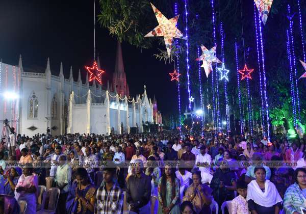 ஆங்கில புத்தாண்டை முன்னிட்டு சென்னை சாந்தோம் சர்ச்சில் நடந்த சிறப்பு பிரார்த்தனை கூட்டத்தில் பங்கேற்ற கிறிஸ்தவர்கள்.
