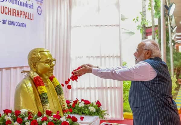 திருச்சி பாரதிதாசன் பல்கலை.,க்கு வந்த பிரதமர் மோடி, அங்குள்ள பாரதிதாசன் சிலைக்கு மலர் தூவி மரியாதை செலுத்தினார்.