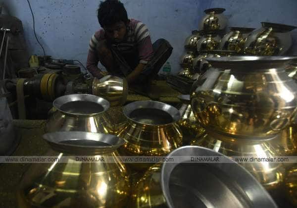 பொங்கல் பண்டிகையை நெருங்குவதையொட்டி திருநெல்வேலி பேட்டை பகுதியில் விற்பனைக்காக தயாராகும் பித்தளை பானைகள்.