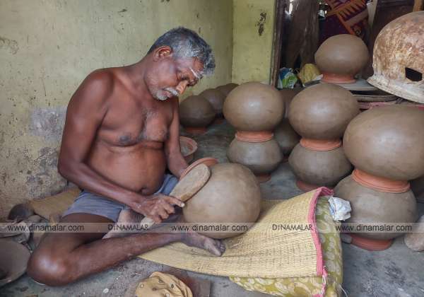 பொங்கல் முன்னிட்டு பொங்கல் பானை செய்யும் பணியில் ஈடுபட்டுள்ள தொழிலாளி. இடம்:விழுப்புரம்