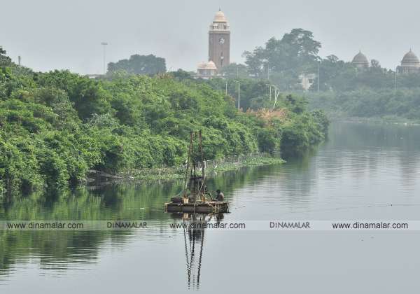 கூவம் ஆற்றை இயந்திரம் வைத்து சுத்தம் செய்யும் பணியில் ஈடுபட்டுள்ள ஊழியர்கள். இடம்: சென்னை, திருவல்லிக்கேணி