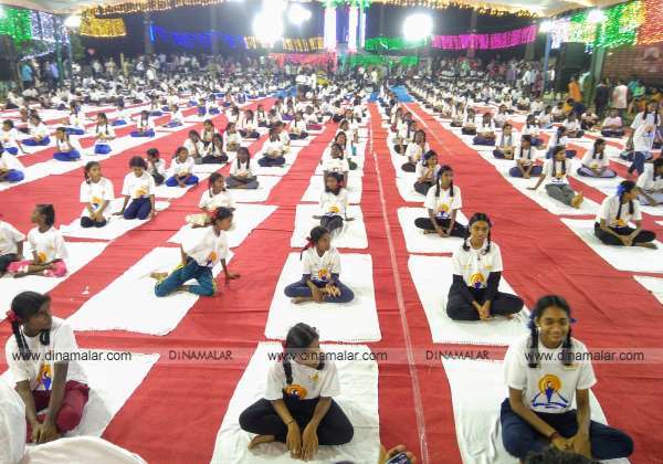 புதுச்சேரி கடற்கரை சாலை காந்தி திடலில் 29 ஆம் அகில உலக யோகா திருவிழாவில் கலந்து கொண்ட மாணவியர்.