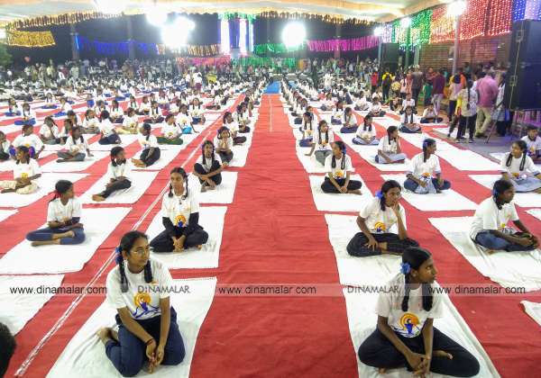 புதுச்சேரி கடற்கரை சாலை காந்தி திடலில் 29 ஆம் அகில உலக யோகா திருவிழாவில் கலந்து கொண்ட மாணவியர்.