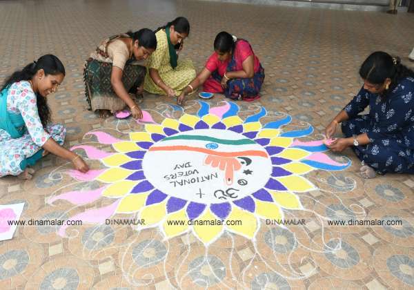 திருப்பூர், கலெக்டர் அலுவலக வளாகத்தில் மகளிர் சுய உதவி குழுக்களுக்கு வாக்காளர் விழிப்புணர்வு குறித்த கோலப்போட்டி நடந்தது.