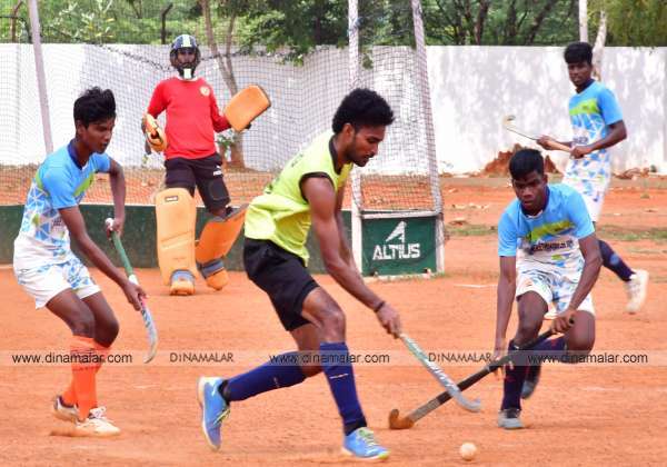 சிவகங்கையில் நடந்து வரும் மாநில அளவிலான ஹாக்கி போட்டியில் விழுப்புரம் அணியும் சிவகங்கை அணியும் மோதின.