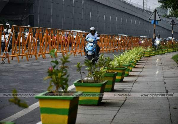 சென்னை மீனம்பாக்கம் விமான நிலையம் எதிரில் பாதசாரிகள் நடைபாதையை அலங்கரிக்கும் விதமாக செடிகள் வைக்கப்பட்டுள்ளது.