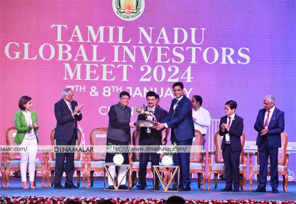 சென்னையில் நடக்கும் உலக முதலீட்டாளர்கள் மாநாட்டில் பங்கேற்ற மத்திய அமைச்சர் பியுஷ் கோயலுக்கு, தமிழக முதல்வர் ஸ்டாலின் நினைவுப்பரிசு வழங்கினார்.