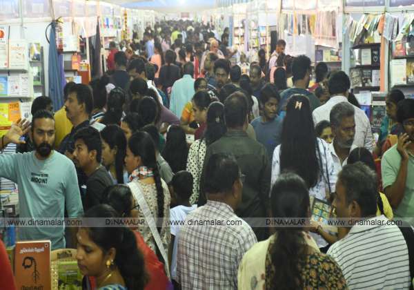 சென்னை நந்தனம் ஒய்.எம் .சி மைதானத்தில் நடந்து வரும் புத்தகக் கண்காட்சியின் இடம்பெற்றுள்ள புத்தகங்களை வாங்க குவிந்த மக்கள் கூட்டம்.