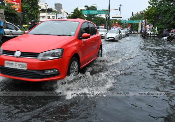 புதுச்சேரியில் பெய்து வரும் தொடர் மழையால் இந்திரா காந்தி சிலை சிக்னலில் மழைநீருடன் கழிவுநீர் கலந்து தேங்கி நிற்கிறது. தண்ணீரில் ஊர்ந்து செல்லும் வாகனங்கள்.