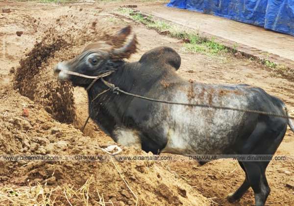 சிவகங்கை அருகே கண்ணாரிப்பு கிராமத்தில் மஞ்சுவிரட்டுக்காக காளை மண்குத்தும் பயிற்சியில் ஈடுபட்டுள்ளது