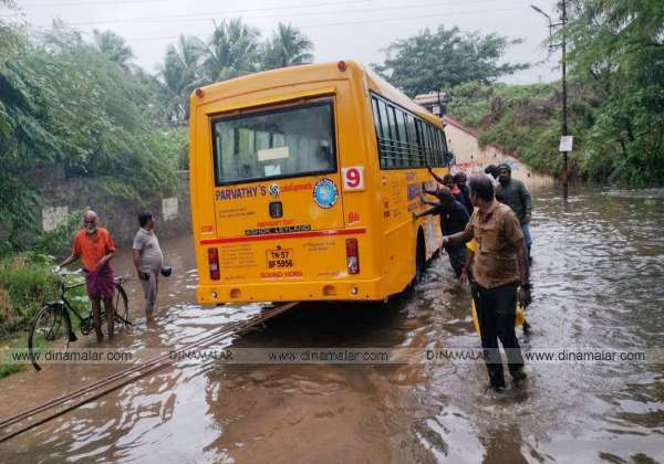 தொடர் மழையால் திண்டுக்கல் ஒத்தக்கண் பாலத்தில் தண்ணீரில் சிக்கிய பள்ளி பஸ்.