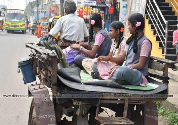 அரசு பஸ் தொழிற்சங்கங்கள் வேலை நிறுத்தத்தால் திருவள்ளூர் ஜே என் சாலையில் ஆபத்தான முறையில் மீன் பாடி வண்டியில் செல்லும் பள்ளி மாணவிகள்