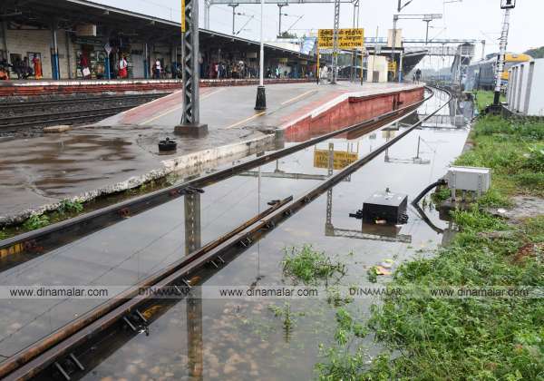 தொடர் மழையால் திண்டுக்கல் ரயில்வே ஸ்டேஷன் தண்டவாளங்களில் தேங்கியுள்ள மழைநீர்.