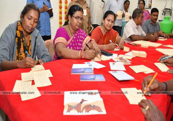 கோவை ஆர்.எஸ்.,புரம் தலைமை தபால் அலுவலகத்தில் வாழ்த்து அட்டைகள் குறித்து விழிப்புணர்வு ஏற்படுத்தும் வகையில் வாழ்த்து அனுப்பலாம் வாங்க நிகழ்ச்சி நடந்தது. இதில் ஆர்வத்துடன் வாழ்த்து அட்டைகள் எழுதிய தபால் ஊழியர்கள்.