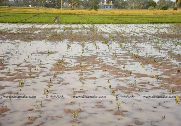 கடலூர் அடுத்த நாணமேடு கிராமப் பகுதியில் மழைநீரால் சேதமான கத்தரி செடிகள்.