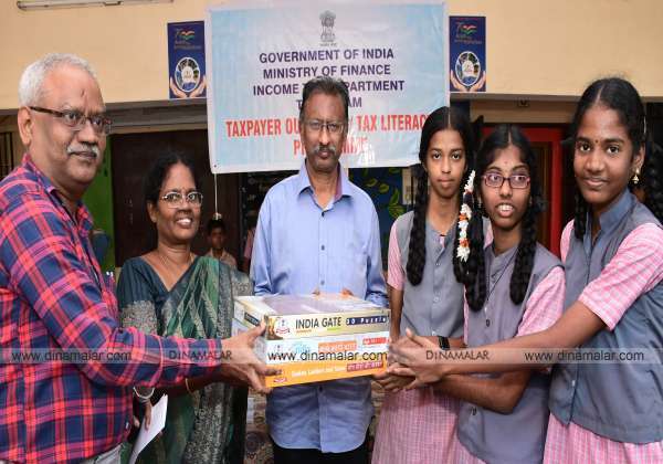 தாம்பரம் சரக வருமானவரித்துறை அலுவலகம் சார்பில் மேற்கு தாம்பரம் அரசு நகராட்சி உயர் நிலை பள்ளி மாணவர்களுக்கு வருமான வரித்துறை சார்பில் விழிப்புணர்வு நிகழ்ச்சி நடத்தப்பட்டது. இதில் மாணவ ,மாணவியர்களிடம் கேட்கப்பட்ட கேள்விகளுக்கு சரியான பதில் அளித்தவர்களுக்கு பரிசு வழங்கிய சென்னை வருமான வரித்துறையின் இணை ஆனையாளர் அணில் குமார் ( உடன் இடமிருந்து வலம் ) வருமான வரித்துறையின் துணை ஆனையாளர் ஸ்ரீ ராம் , பள்ளியின் தலைமை ஆசிரியர் ராஜேஸ்வரி .இடம் : மேற்கு தாம்பரம்